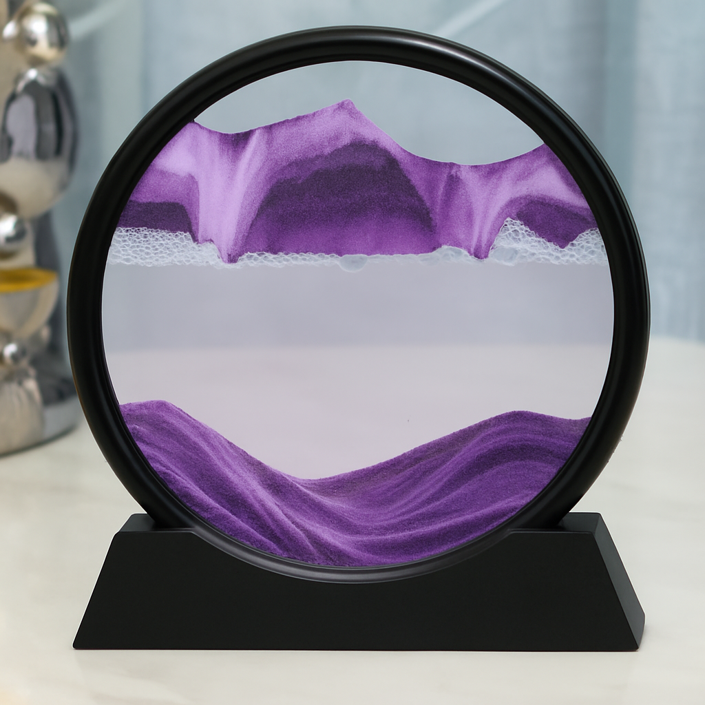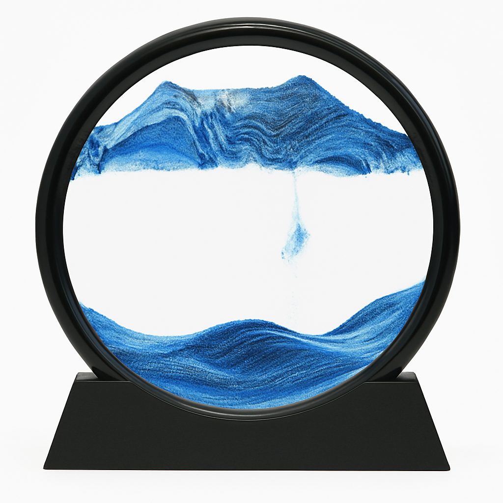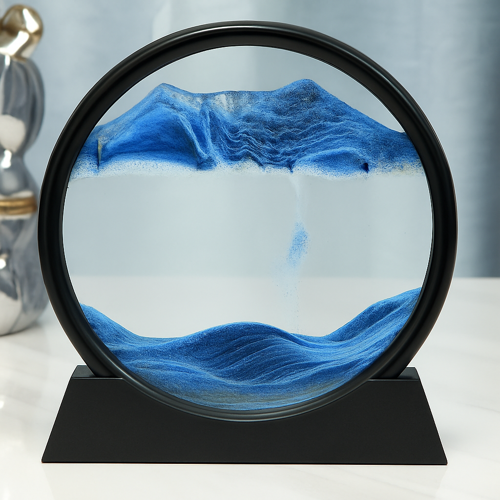 Breng rust en schoonheid in huis of op kantoor met deze 3D bewegende zandloper in een ronde glazen lijst. Elk keer dat je het schilderij draait, creëren de stromende lagen zand unieke landschappen en patronen. Het moderne ontwerp is ideaal als decoratie voor bureaus, woonkamers of als bijzonder cadeau. Gemaakt van hoogwaardig glas en beschikbaar in meerdere kleuren. Afmeting: 18 x 19 cm.