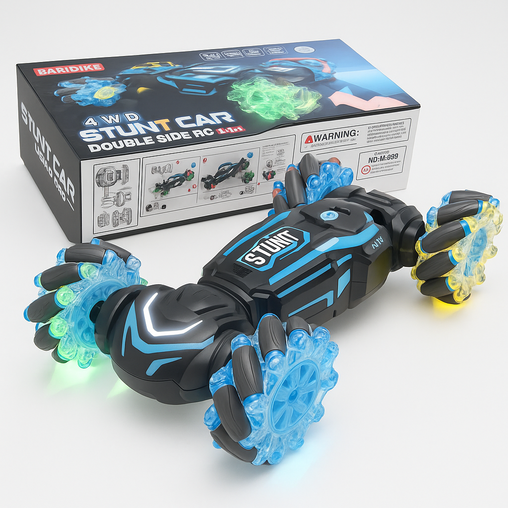 Beleef ultiem speelplezier met deze 4WD RC stuntauto met licht en geluid. De auto is speciaal ontworpen voor kinderen vanaf 6 jaar en biedt indrukwekkende stunts, snelle drifts en 360° rotatie dankzij de krachtige motor en vierwielaandrijving. Met de draadloze 2.4G afstandsbediening kun je eenvoudig alle bewegingen besturen.