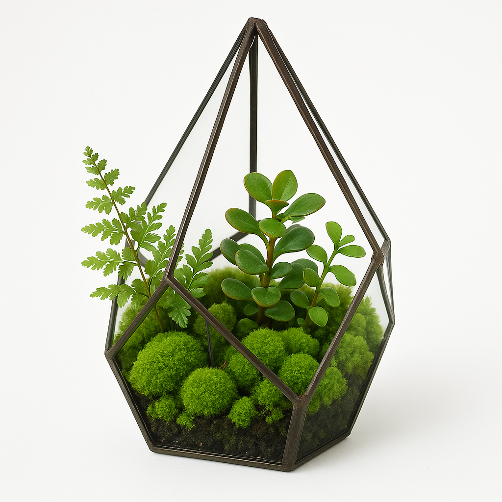 Het tijdloze geometrische ontwerp past perfect in elke woonstijl, van minimalistisch tot industrieel. CreΓ«er eenvoudig je eigen kleine groene oase op tafel, bureau of vensterbank. Dankzij het open ontwerp is het terrarium makkelijk te beplanten en te onderhouden.