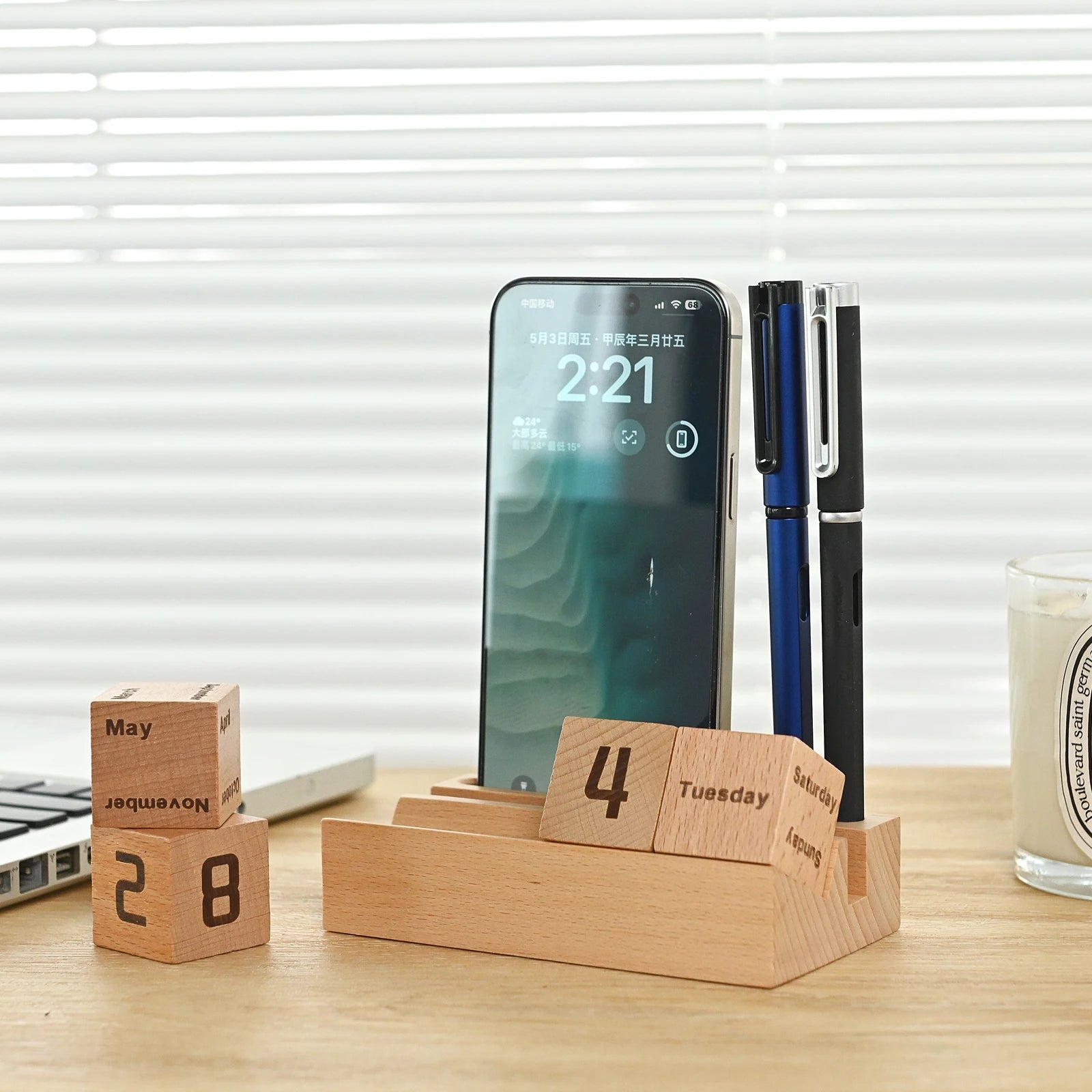 Het natuurlijke hout zorgt voor een warme uitstraling en past naadloos in elk interieur, thuis of op kantoor. Daarnaast biedt de houder ruimte voor pennen en je telefoon. De kalender is compact, duurzaam en milieuvriendelijk – perfect voor wie houdt van een opgeruimd bureau met een stijlvolle touch.