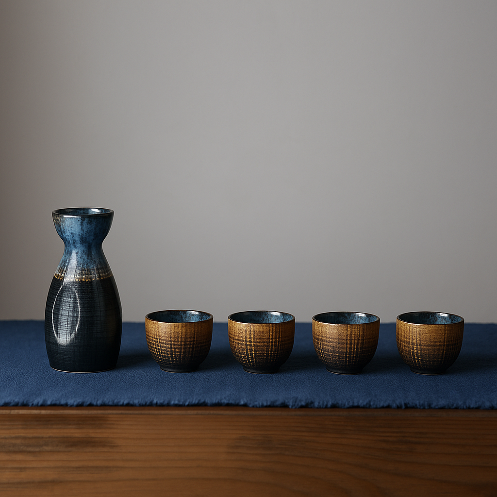 Ervaar authentieke Japanse gastvrijheid met deze keramische sake set, perfect voor het serveren van warme of koude sake tijdens gezellige avonden of diners. De elegante karaf en vier bijpassende bekers zijn met zorg vervaardigd uit hoogwaardig keramiek en voorzien van een uniek glazuur in diepe blauwtinten en aardse accenten, waardoor elke set een stijlvolle uitstraling heeft.