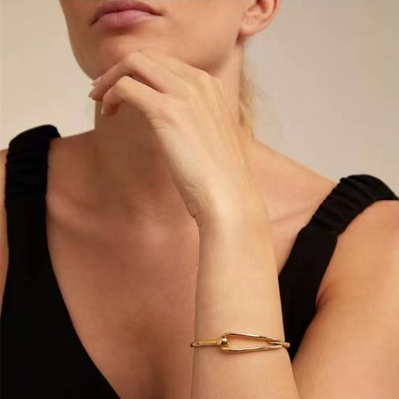Voeg een vleugje elegantie toe aan je look met deze stijlvolle mode armband, verkrijgbaar in goud en zilver. De armband is verfijnd afgewerkt met een moderne, minimalistische twist en is perfect voor dagelijks gebruik of een speciale gelegenheid. Dankzij het zilver vergulde materiaal en het gladde oppervlak straalt dit sieraad luxe uit terwijl het comfortabel blijft om te dragen.