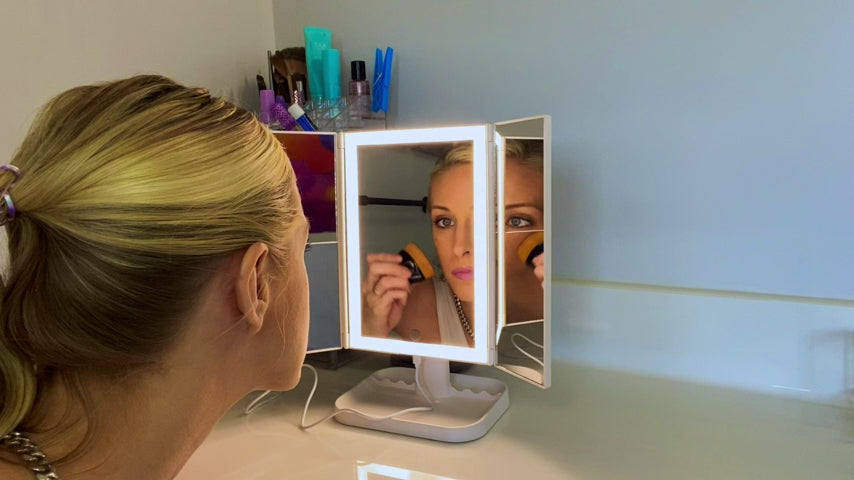 Deze luxe trifold make-up spiegel met 68 LED-lampjes zorgt voor perfecte belichting tijdens het aanbrengen van make-up of scheren. Met drie lichtstanden (warm, natuurlijk en koud) pas je eenvoudig de sfeer aan je wensen aan. De afneembare 10x vergrotende spiegel is ideaal voor precisiewerk, terwijl de draaibare standaard (180Β°) zorgt voor optimale flexibiliteit en comfort.